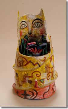 紙(張り子)、古布、粘土などの素材をつかって、郷土玩具のようなホノボノとしたモノから、幻想的なタイプのモノ、オブジェ的なモノまで、いろいろ作っています。これからも様々な手法を試みながら、私なりのネバーランドの住人達をつくりつづけていきたいと思っています。
