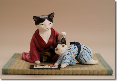 母子猫シリーズ第7段。習字の練習をしている子猫と、それを見守る母猫。今年も親子で福を招きます。