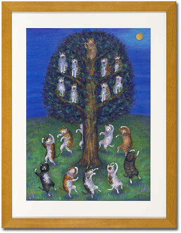 まんまるお月様の夜 大きな木の下で まねきまつりが 開かれます。幸せ願って 平和を願って 沢山の猫たちが 木の周りで まねきおどりを おどります。